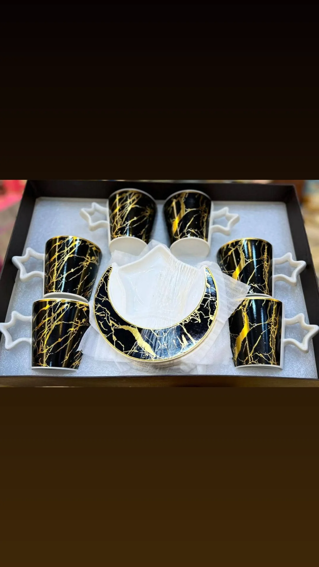 برند😍👌سرویس چای خوری یا شیر خوری سایز بزرگ 🔥6عددکوب دسته دار 🔥6عددنعلبکی مدل ماه وستاره 🔥آبکاری شده 🔥جنس سرامیکی خارجی